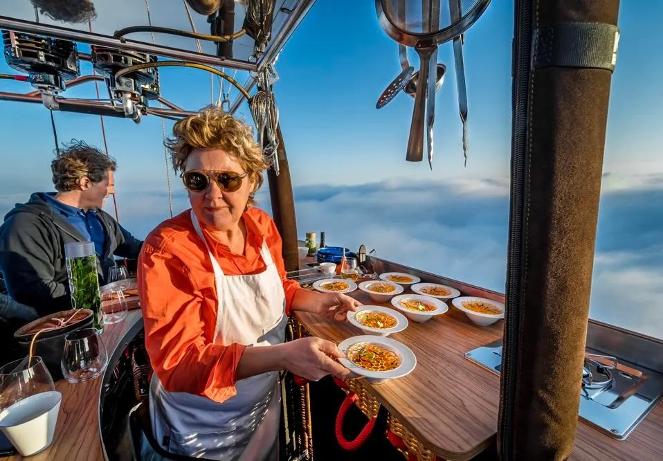O primeiro restaurante de balão de ar quente do mundo, criado pela chef holandesa Angélique Schmeinck, oferece uma experiência única: um jantar de três pratos enquanto flutua pelos céus da Holanda